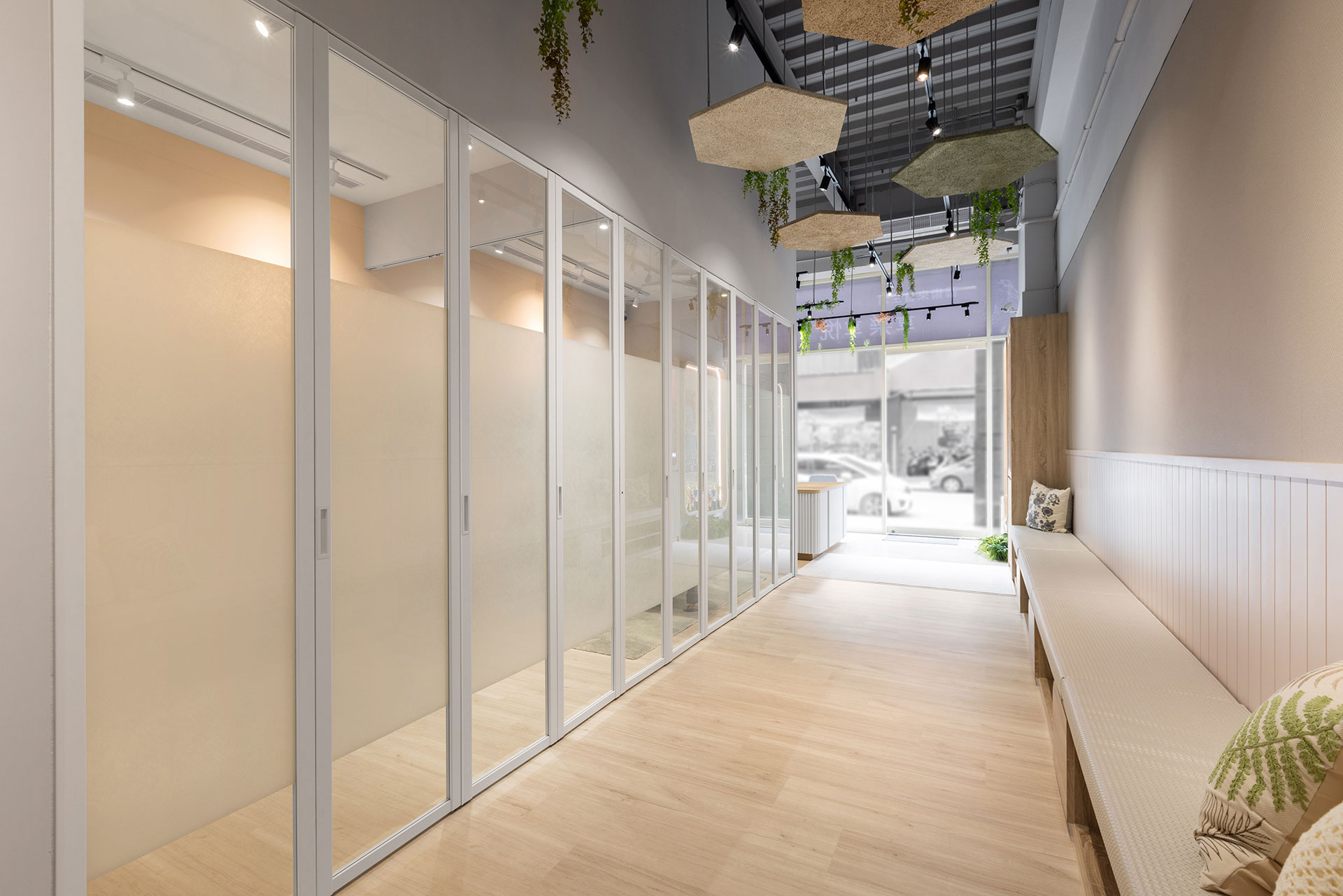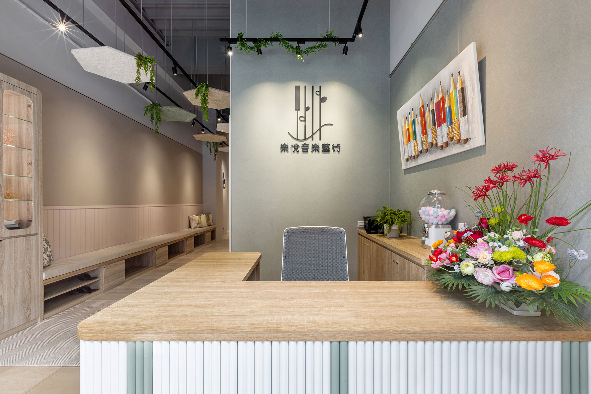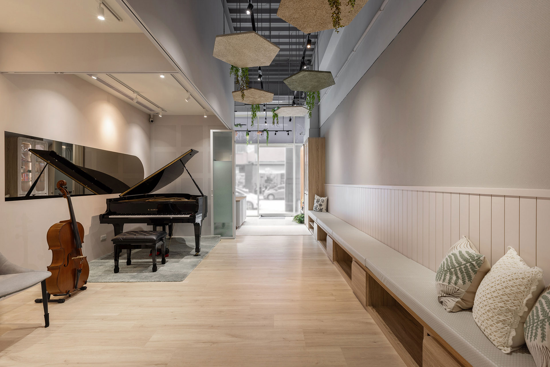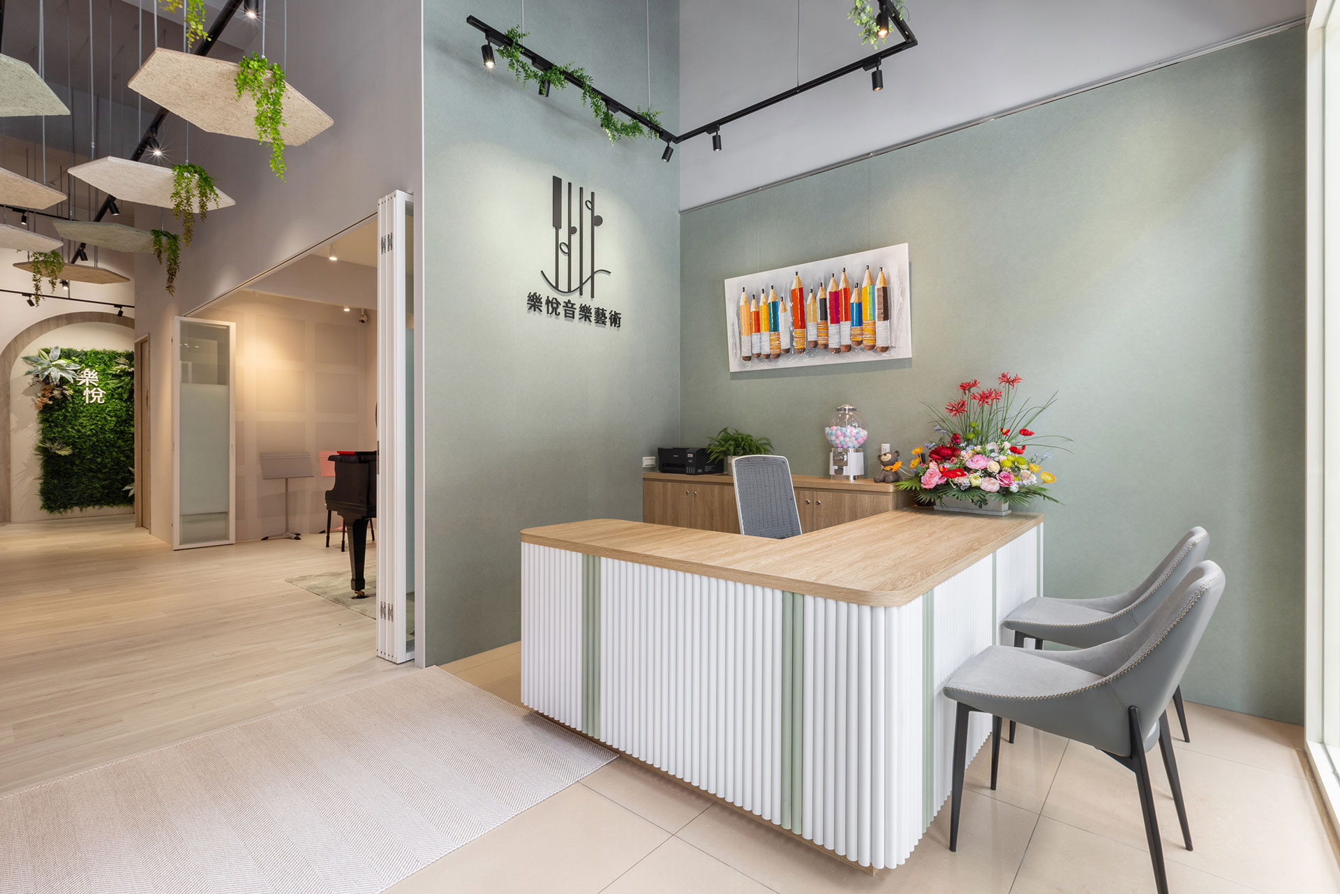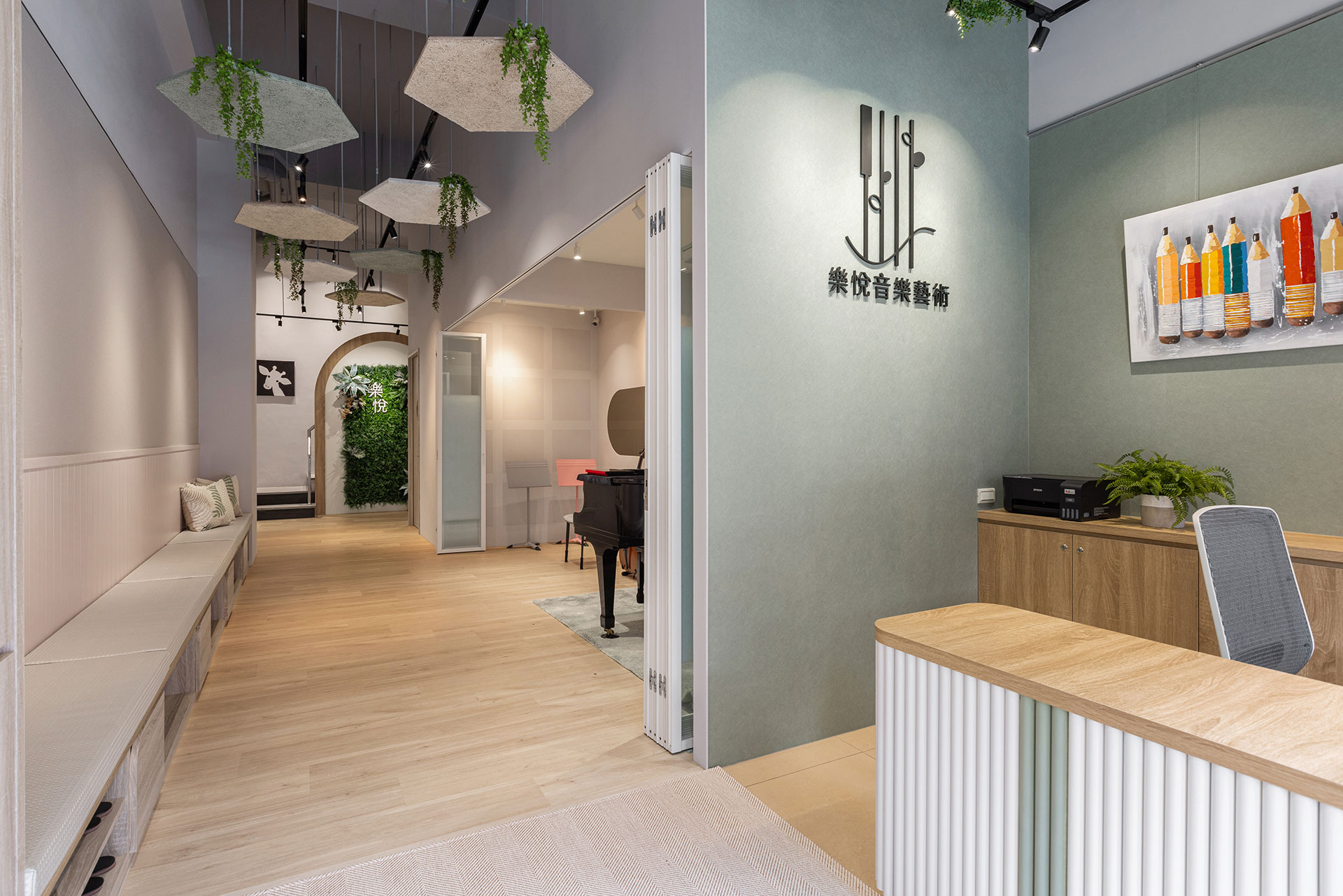 音樂與大自然間的奇妙共鳴,是本次有兩層樓的音樂教室特別想傳達的訊息。整體設計以大地自然暖綠與白樺木質色系為主軸,入門處的迎賓區以及展示牆面,在本各稜角直角處以溫潤的大圓弧淡化尖銳,為業主設計的LOGO也將微笑音符與藤蔓小葉交織一起。沿著左牆面是整排的軟墊臥榻區域,讓父母親或學員孩子們等候或休憩用。對面的教室採用靈活的德製折疊式五金滑門設計,有音樂成果展或發表會時可完全對外開放,亦可在平日分隔成兩個獨立的教室練習。