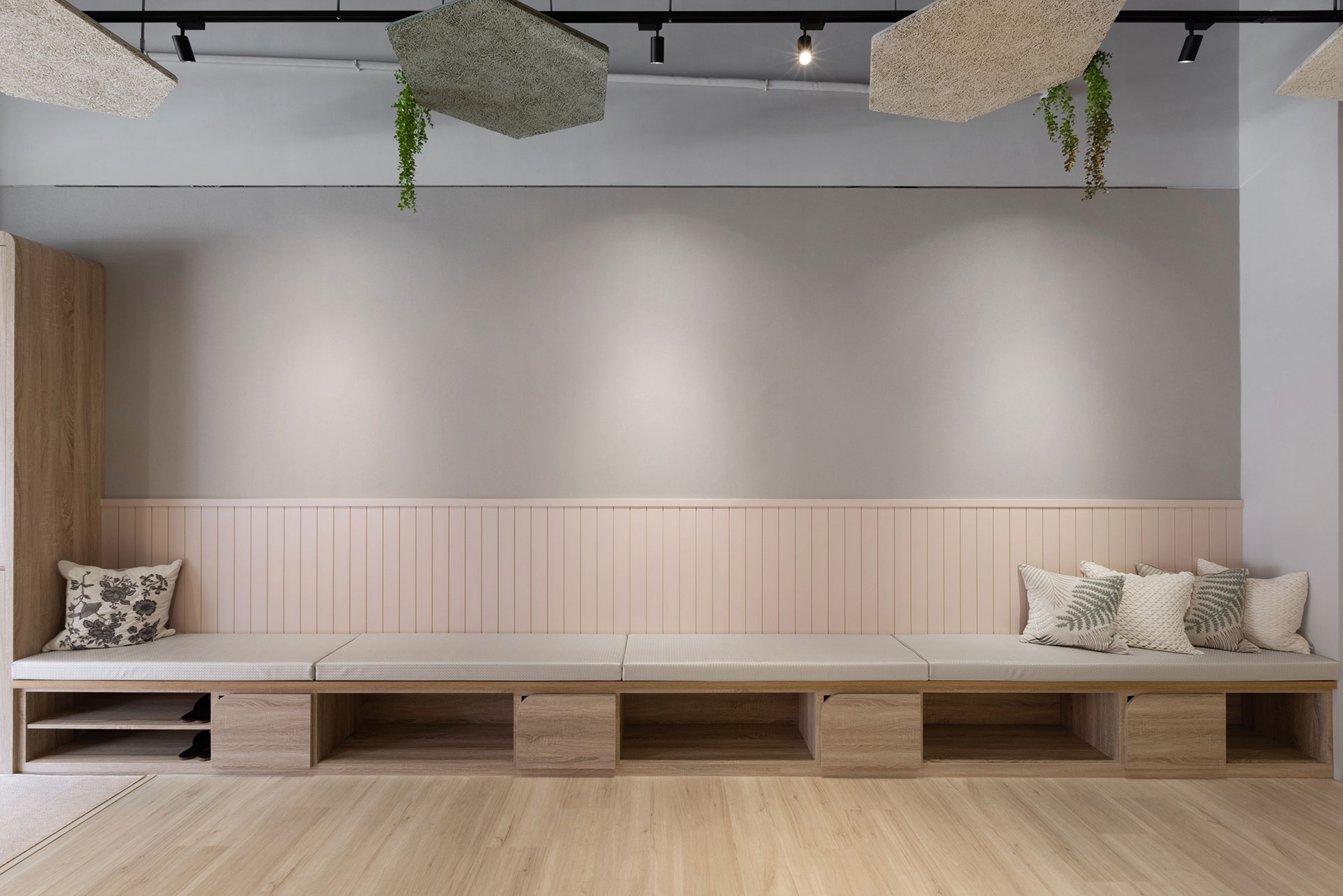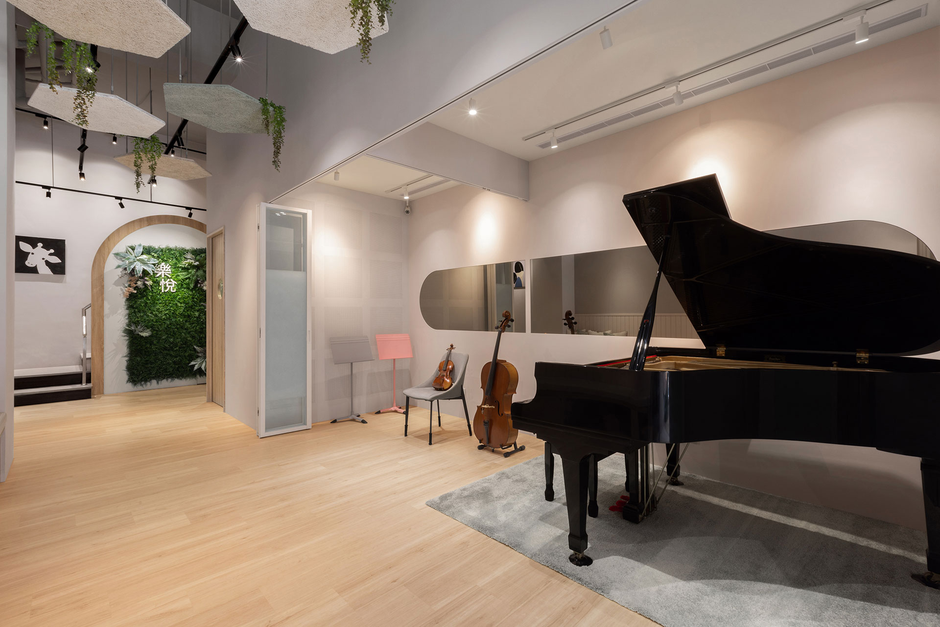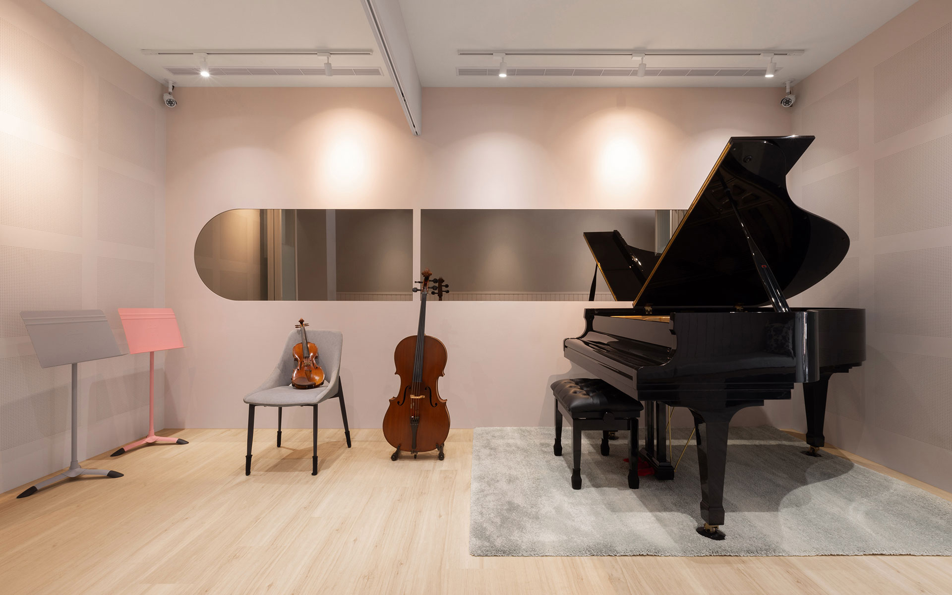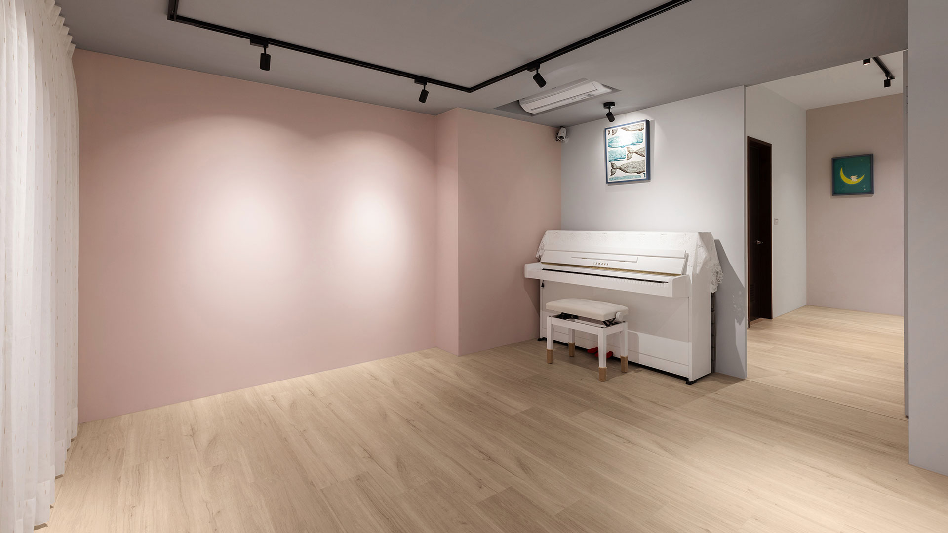 教室內採用柔和的粉灰搭配白色系的聚光燈,牆面使用吸音板大幅降低音量的宣洩,另採用圓角的流金鏡可觀察糾正演奏姿勢。音符跳動間,彷彿在一片粉紅色的夕陽中於森林隙間嬉戲。溫馨的色系氛圍可平穩學習中的焦躁不安,在舒適與寧靜中找到自己的聲音,找到指尖與身體歌唱的和諧表達方式。