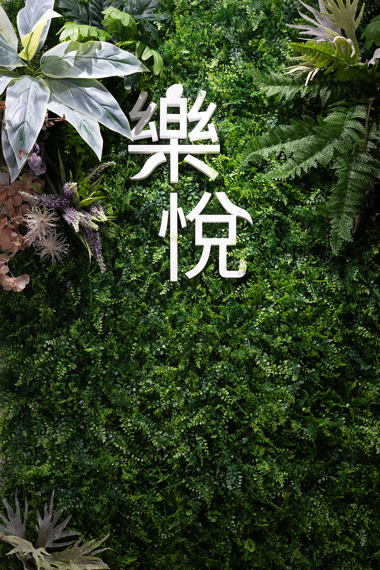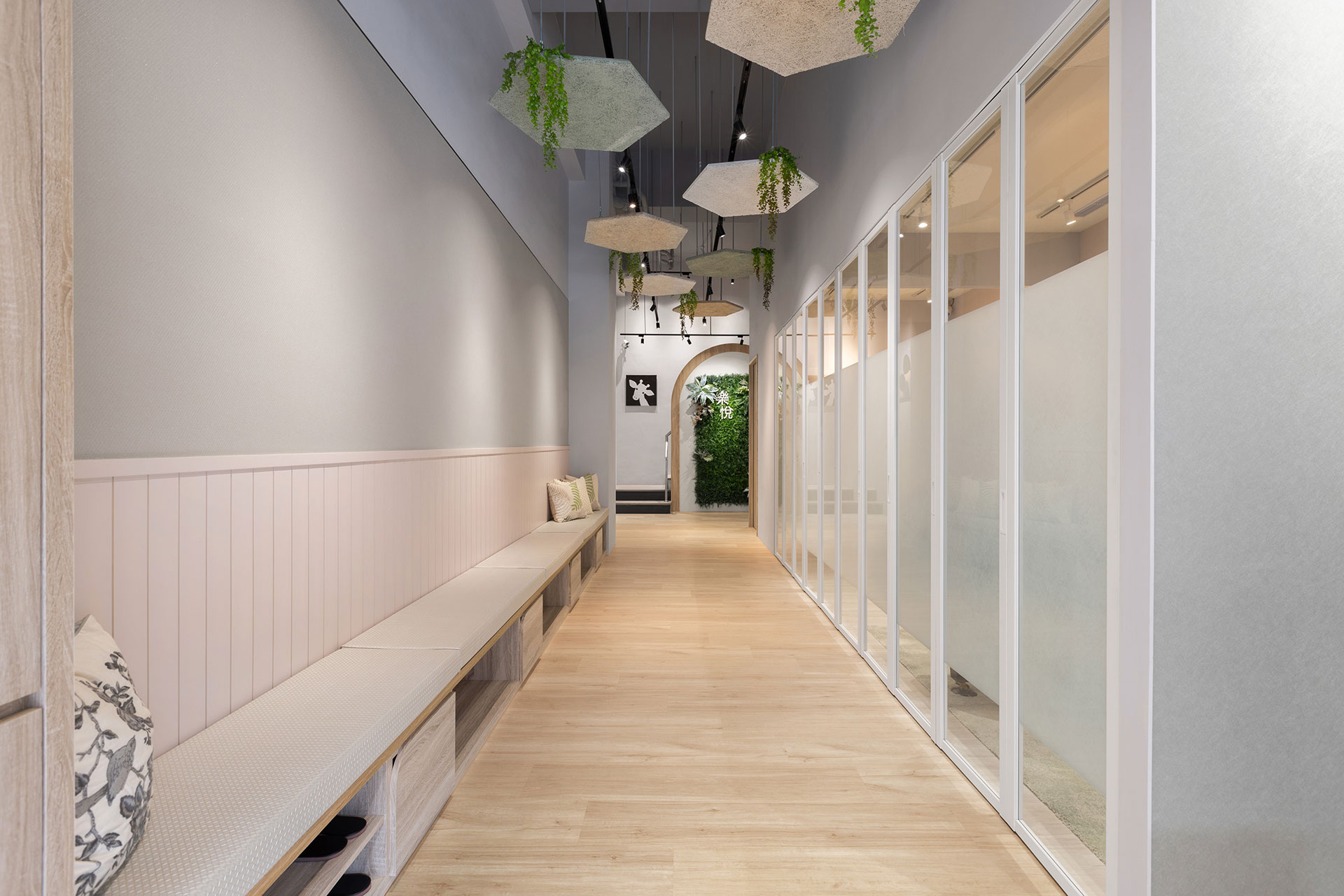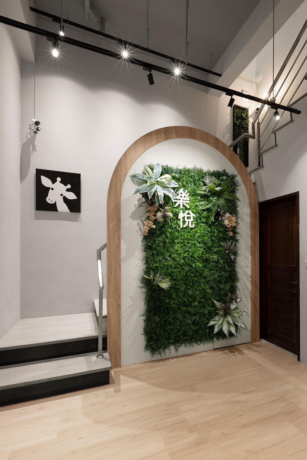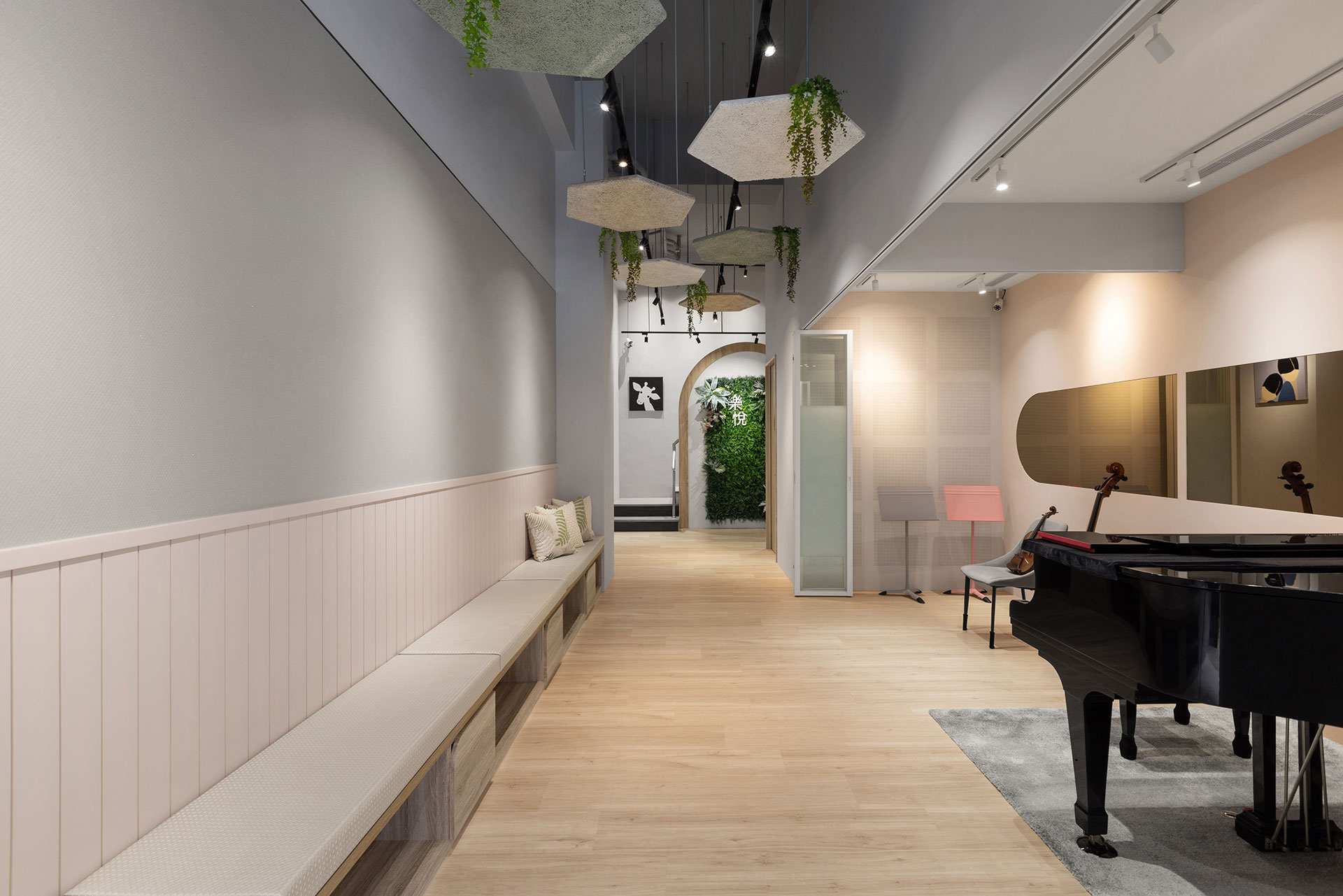 挑高的天花懸浮著六角的小島,是百萬心與愛之蔓等垂吊植物的棲息地,它們在上空凝視著三位專業的鋼琴和大小提琴演奏家,與各個小小音樂家的交匯點。「樂悅」音樂教室靜謐的座落在後方圓拱造型下的尤加利與小山蕨之家,與鹿角蕨跟變葉木私語守候著每個夢想的起點。
