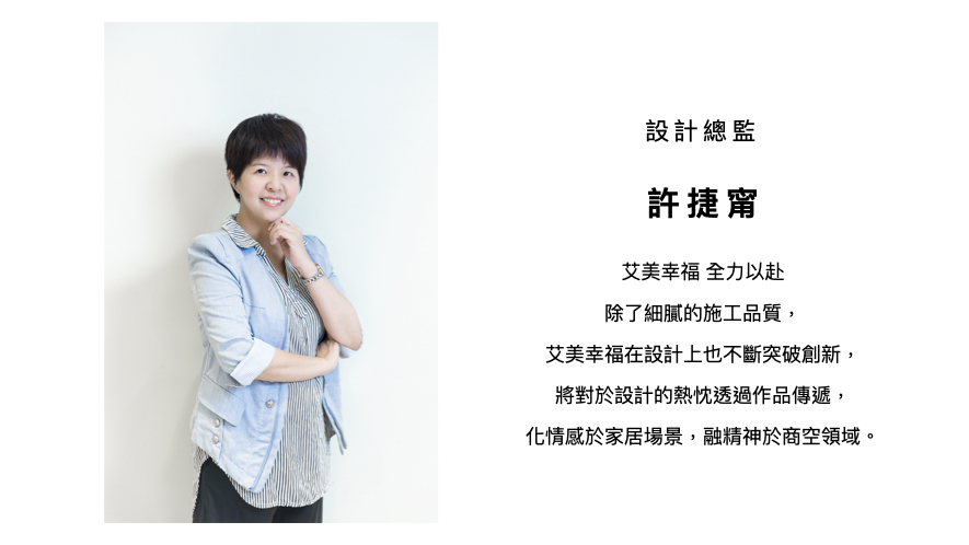「我始終追求能讓人感到『信任』的互動方式,也十分感謝客戶們願意對我敞開心房。」艾美幸福設計 許捷甯 設計總監 從良好的溝通中取得雙方共識,和善而專業的處事態度廣受業主好評,期盼在未來的設計之路上,許總監能創造更多獨具匠心、洋溢無數幸福的精湛作品!