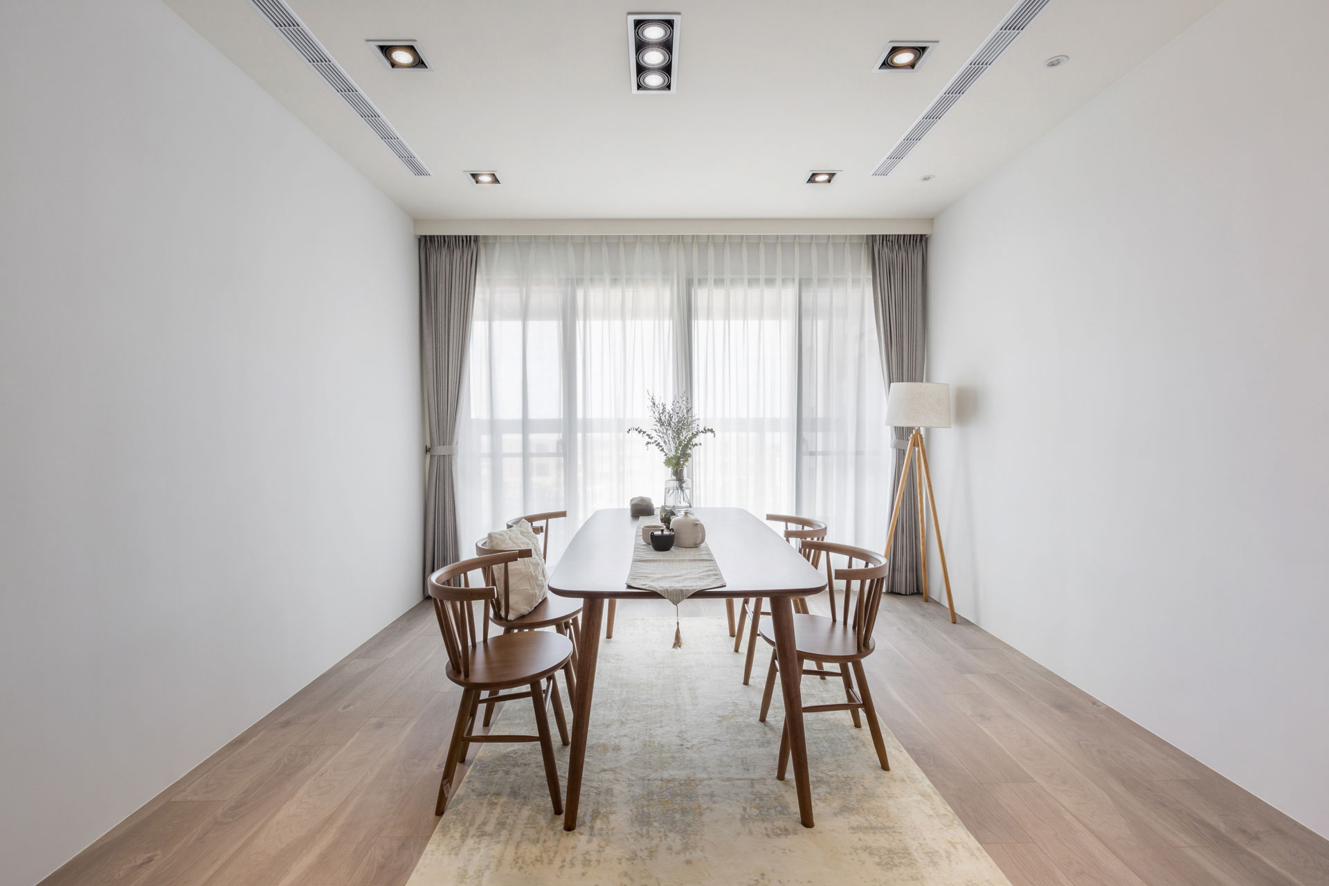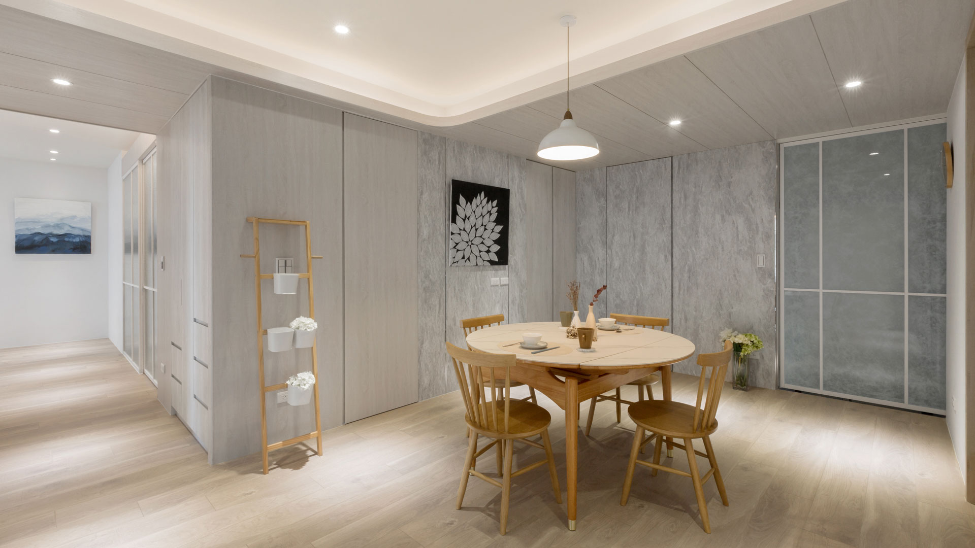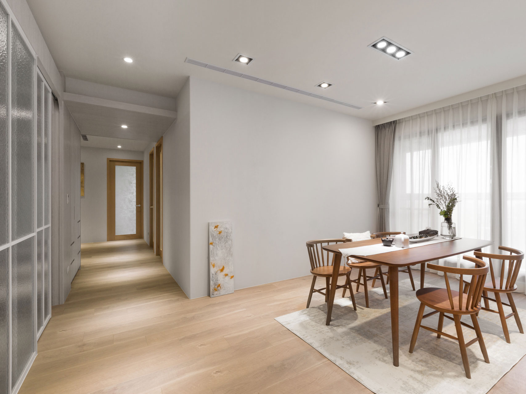整體居家以大麥白與大地色系為基調,往深處走去,兩大儲藏室空間用隱藏門的模式,暗自隱身在銀河白的壁板內。餐廳區域使用可變型餐桌,薄型陶板可呈現大團圓桌與咖啡方桌的模樣。這是各家人從房間步出後的第一個集散地,因格局將對外窗留給每間臥室,後決定每扇門也都使用木框嵌透明玻璃夾棉紗方式,導入四個房間內的陽光到餐廳區域,居家的中心地帶也有充足的光線被照亮。