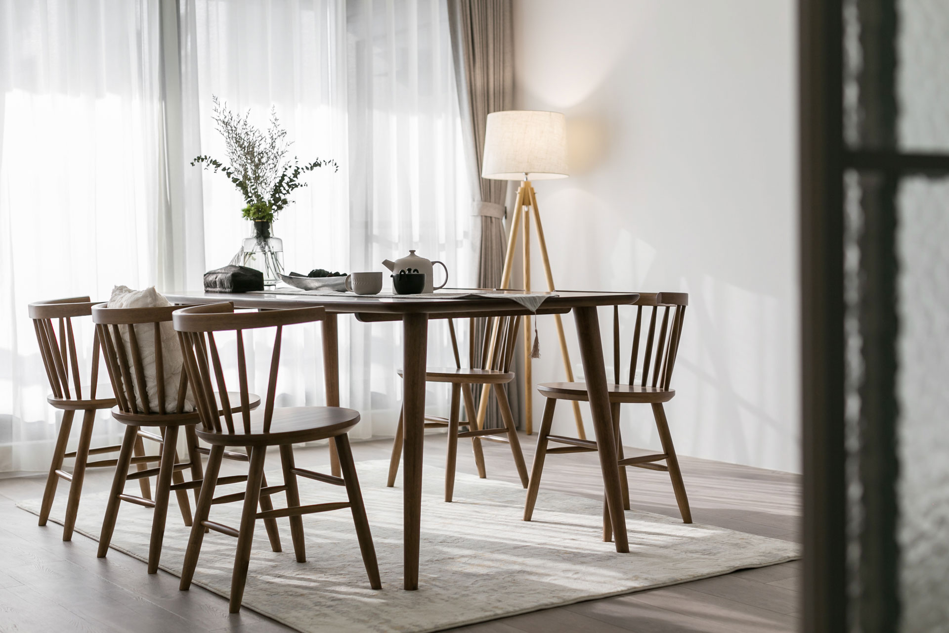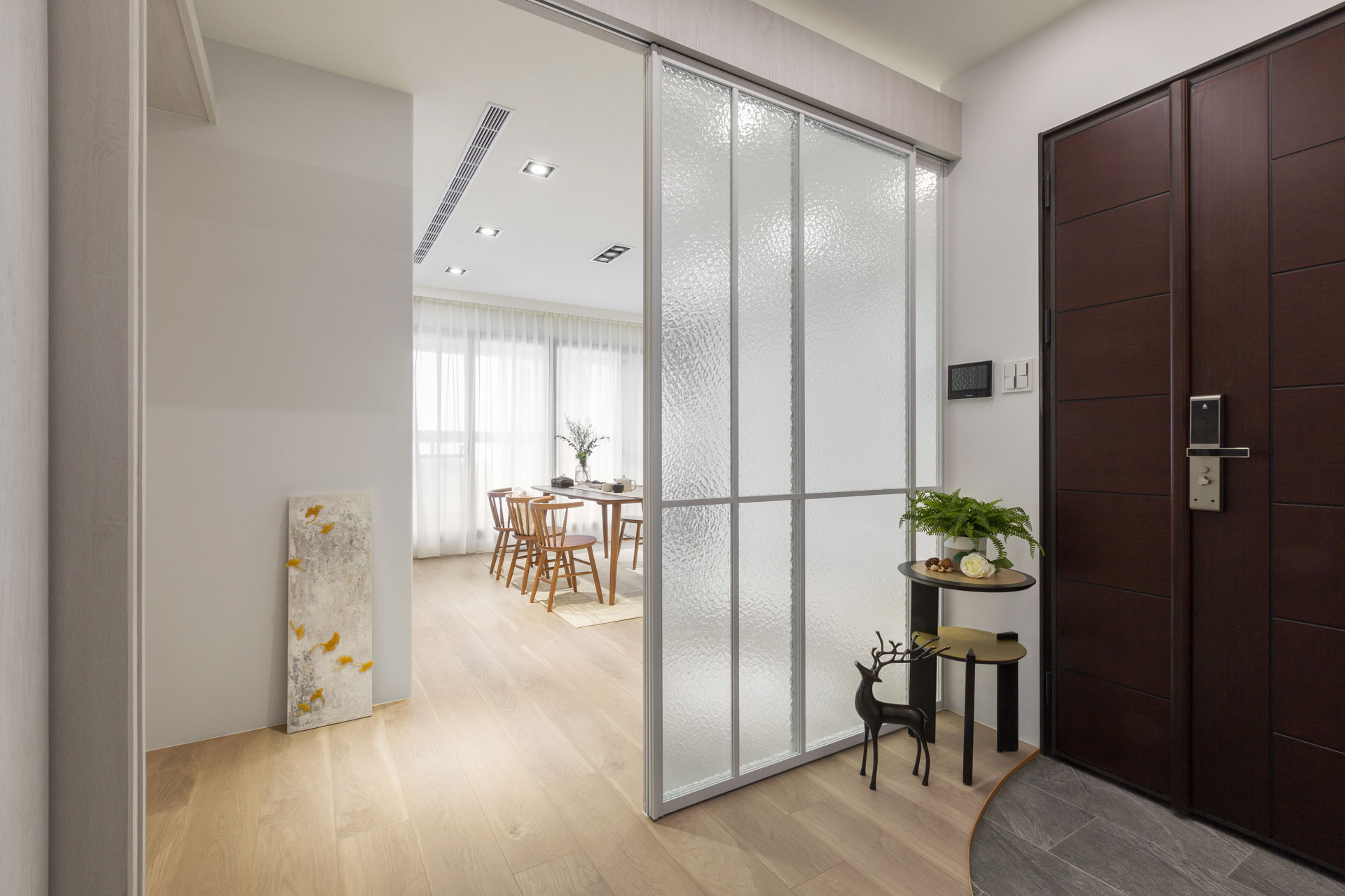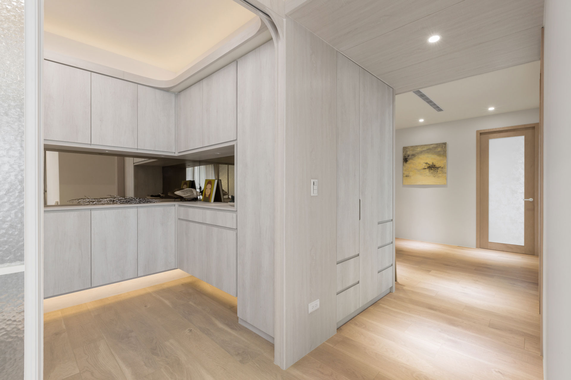 整體居家以大麥白與大地色系為基調,往深處走去,兩大儲藏室空間用隱藏門的模式,暗自隱身在銀河白的壁板內。餐廳區域使用可變型餐桌,薄型陶板可呈現大團圓桌與咖啡方桌的模樣。這是各家人從房間步出後的第一個集散地,因格局將對外窗留給每間臥室,後決定每扇門也都使用木框嵌透明玻璃夾棉紗方式,導入四個房間內的陽光到餐廳區域,居家的中心地帶也有充足的光線被照亮。