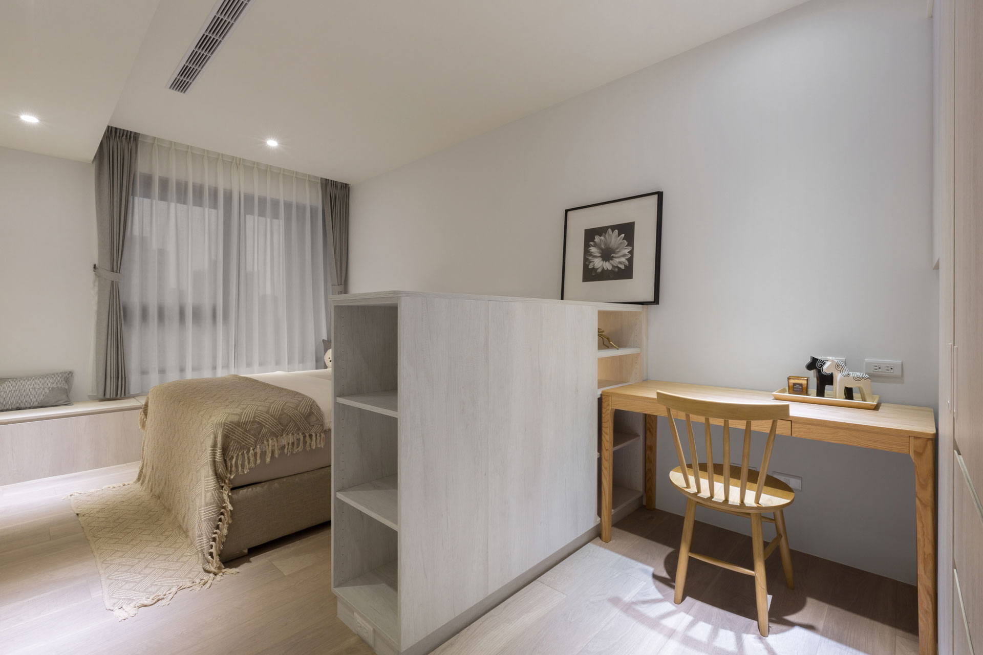 不需要電視跟螢幕,也不用準備PLAY STATION,推開波光粼瀲的滑門屏風,,是去沙發化的客廳去愈,回歸到一家齊聚時最單純的模樣。溫潤的實木質感長形工作桌上,讓電子產品的發語權降到最低,不讓小框螢幕的死寂吃掉彼此相處的時間。大人與小孩能在同一空間內,面對面的工作與讀書,專注看著家人的臉即時地溝通交談。兩個龍鳳胎的寶貝在大書桌上競賽數學速算,清風乍起,客廳一隅還有能彈奏鋼琴與小提琴的練琴空間,是為極有音樂天賦的大女兒的絕對存在。