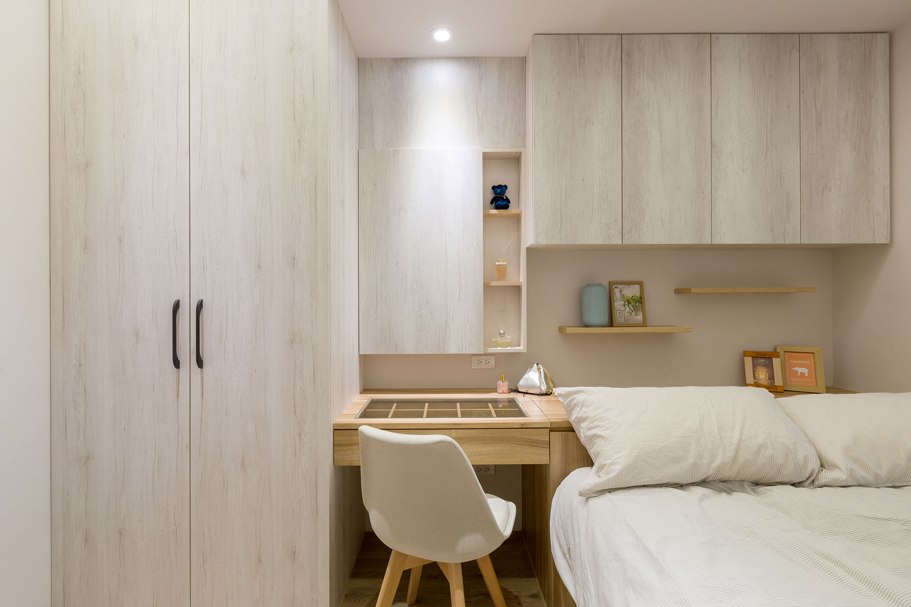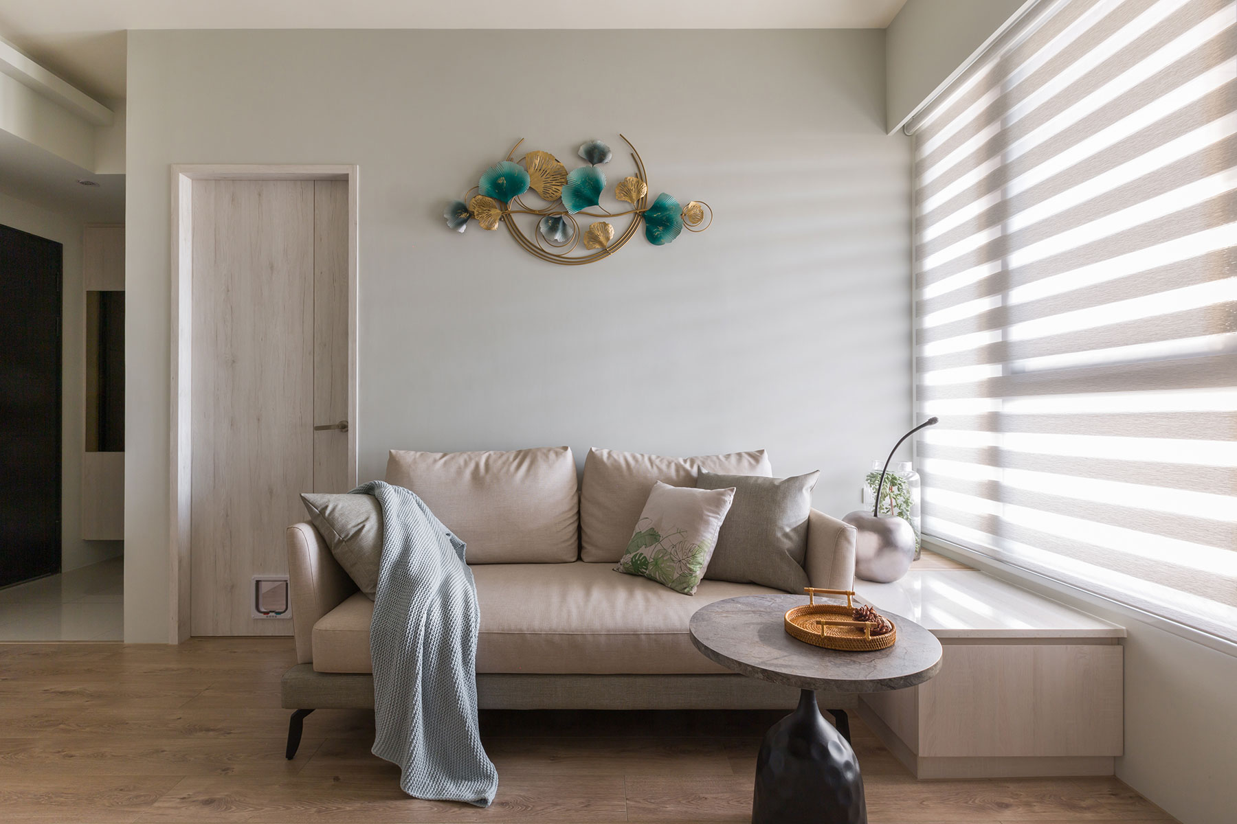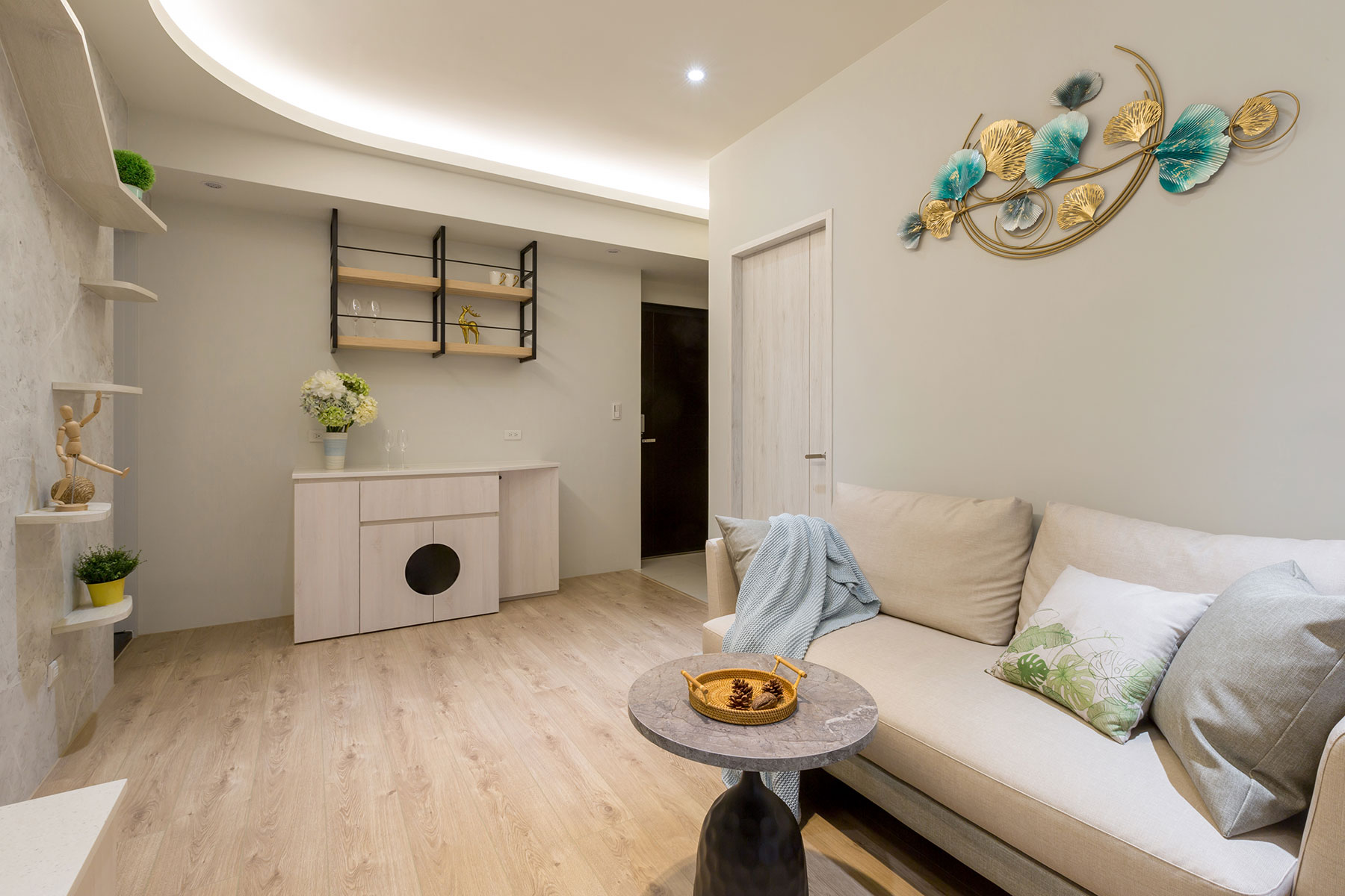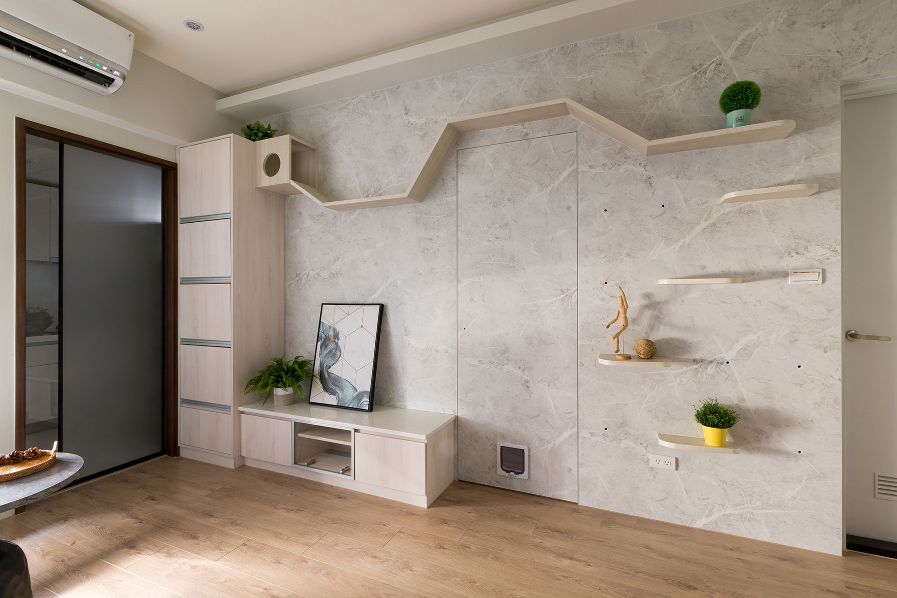 由年輕夫妻與寵物貓組成的三口之家,在滿足收納需求之餘,更希望能讓愛貓自在活動,因此經充分考量人、貓的生活型態後,結合智能科技應用,劃設雙方皆能自適共處的硬軟裝樣式,同時融入清新色系及柔和暖光,讓完善機能與舒緩的居家氛圍,成就活潑溫馨日常。