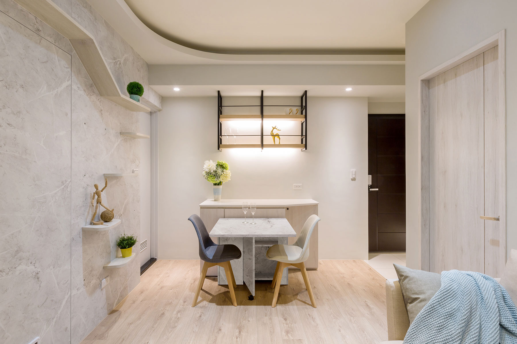 A young couple and a pet cat establish a family of three. Besides meeting the storage demands, what more is to set up a smooth flow for the cat to move around freely. Accordingly, take the living habits of people and cat into account, and then incorporate with the intelligent technology application; ingeniously configure a comfy and accommodating circumstance for the whole family. And apply the fresh color theme and gentle warm lighting to perfect the function. Ultimately, bring about a lively, cozy, and homey ambiance.